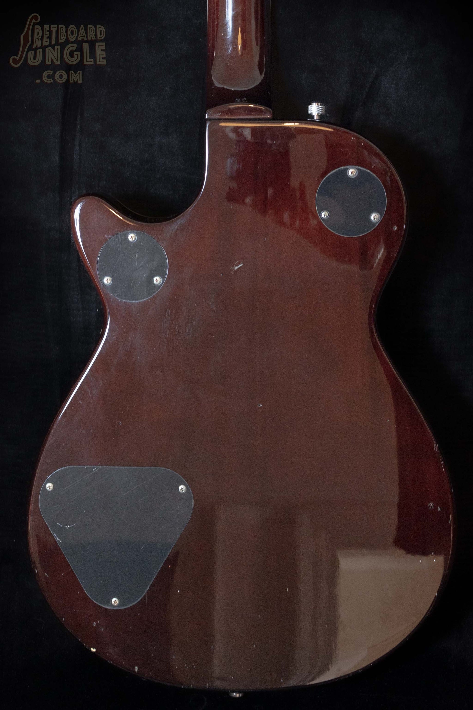 To aid in tuning stability, this Gretsch has been fitted with a roller nut and roller bridge assembly, which eliminate the usual friction points associated with Bigsby tremolo bar. There is a black circle near the bass side bridge. This looks like it may have been a relocation of the original bridge post. Other than that, this guitar is completely original.