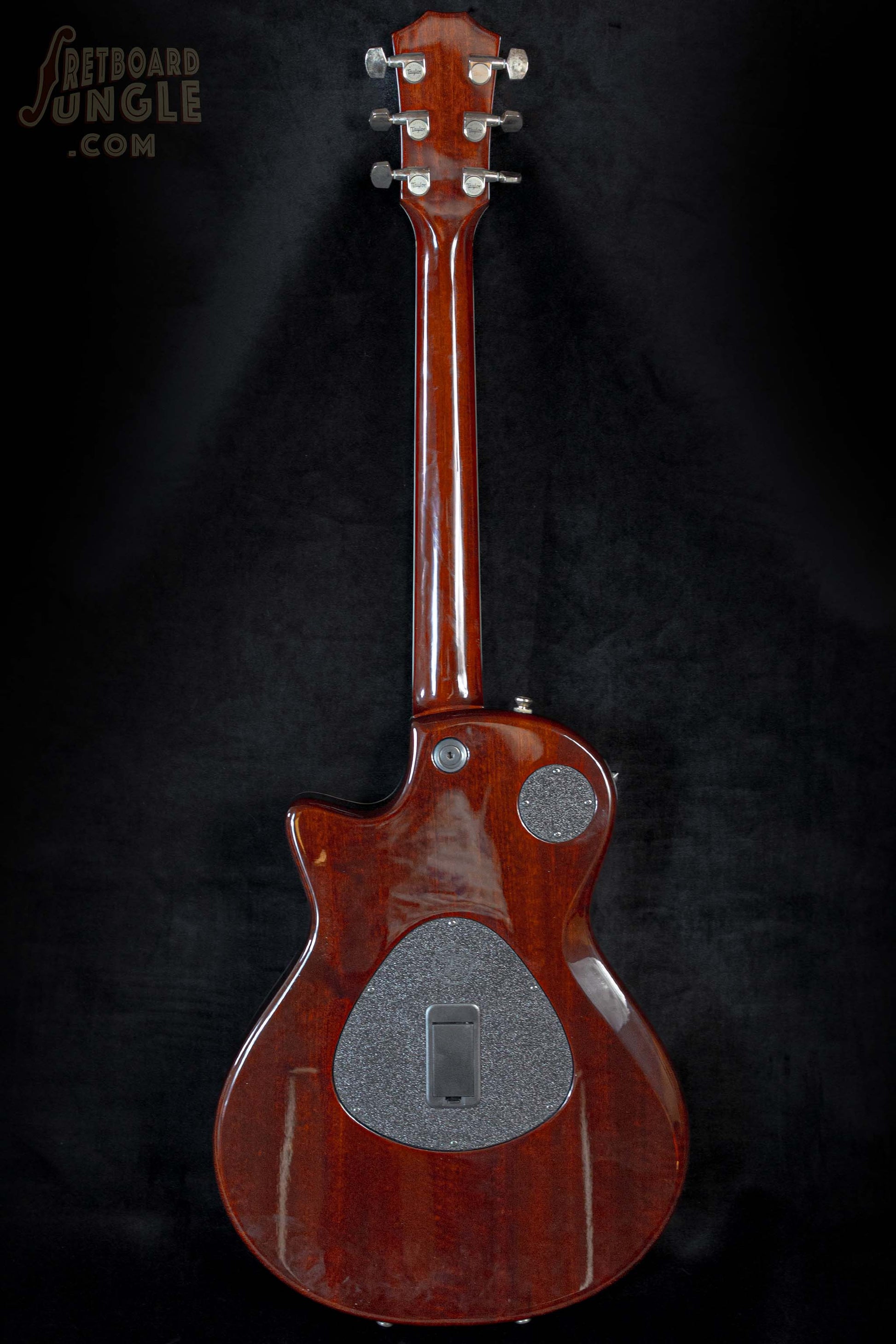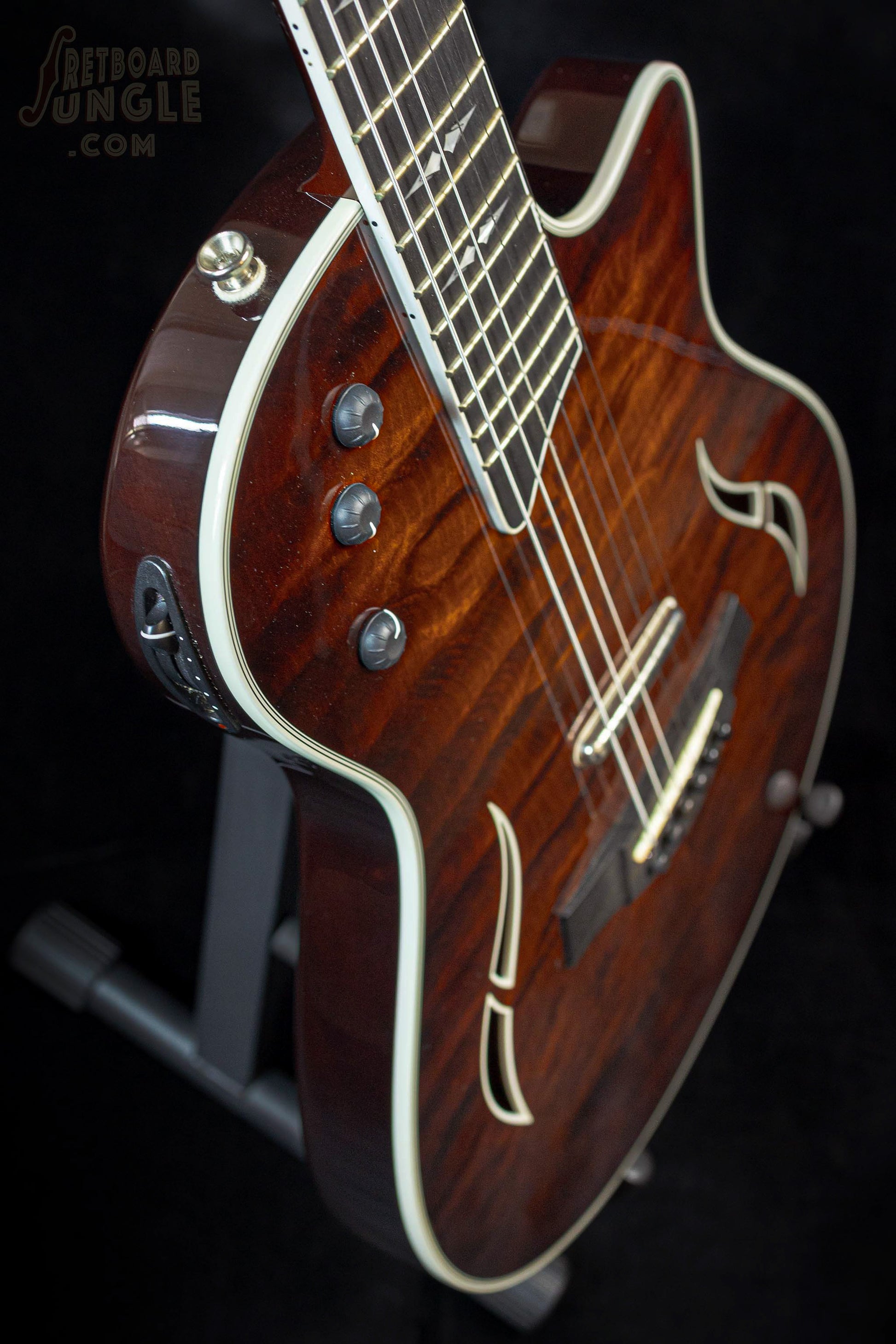 This T5z Pro sports three pickups. An internal acoustic sensor, a visible hum bucking bridge pickup and a discreet, under top neck hum bucking pickup. These are controlled by a 5 way switch on the top side, and three small dials (volume, bass and treble) on the top. The hollow construction of this instrument gives decent natural acoustic projection without being plugged in. This 2017 model features two f holes and top mounted tone and volume. Later Pro models have one F hole, and volume and tone controls on the lower bout.
