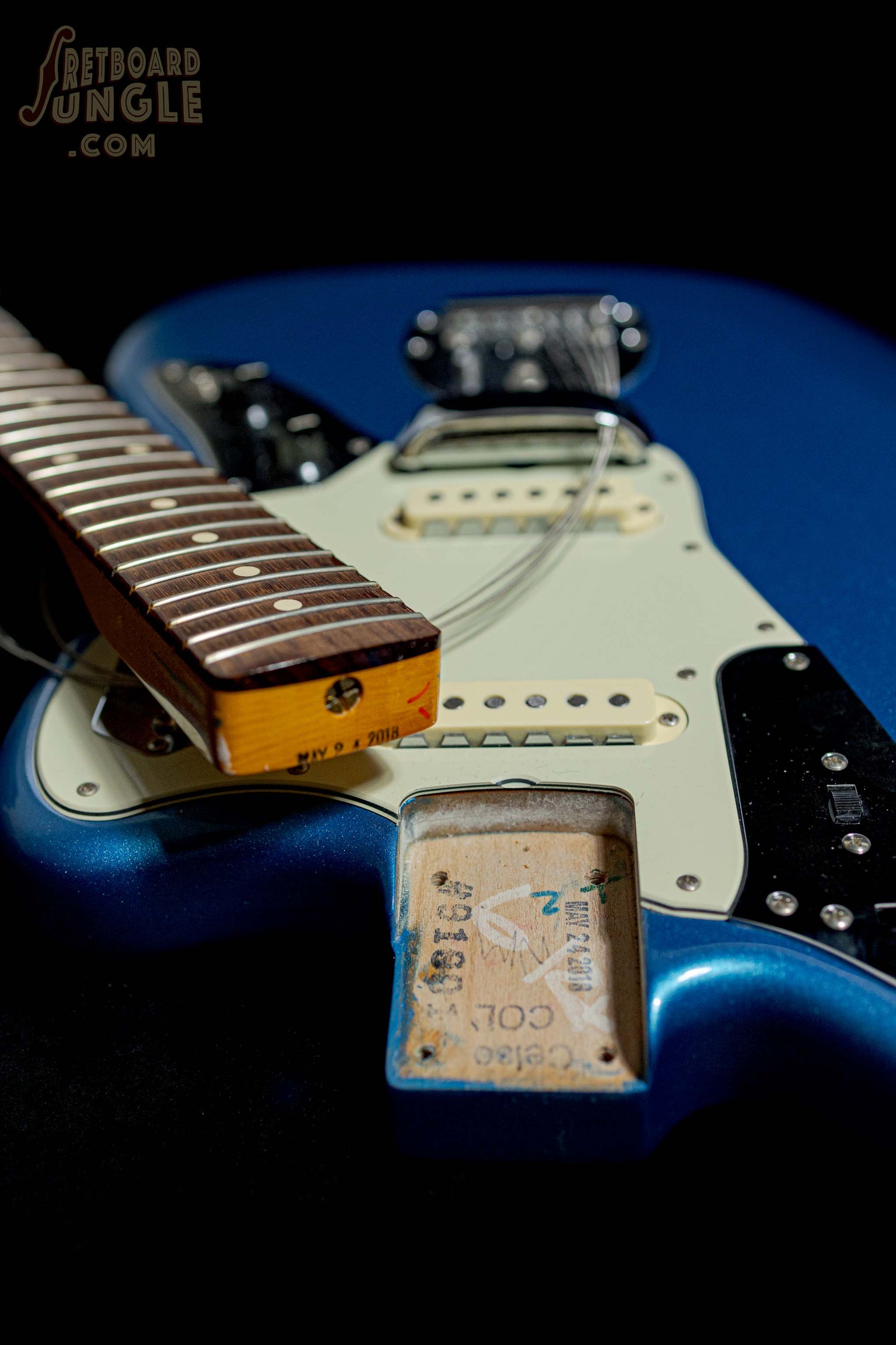 This model features a set of Bear Knuckle custom wound Johnny Marr signature pickups which are based on a 1962 Fender Jag. The neck is a slightly chunky C, which gives this guitar a very vintage feel. It has a slab, 1962 style rosewood fretboard and medium jumbo frets. The vibrato system has been upgraded and features a nylon bushing, which gives precise control over pitch modulation. This guitar also features a Mustang style bridge, which Johnny Marr prefers for its precise string separation, intonation and more streamlined design.
