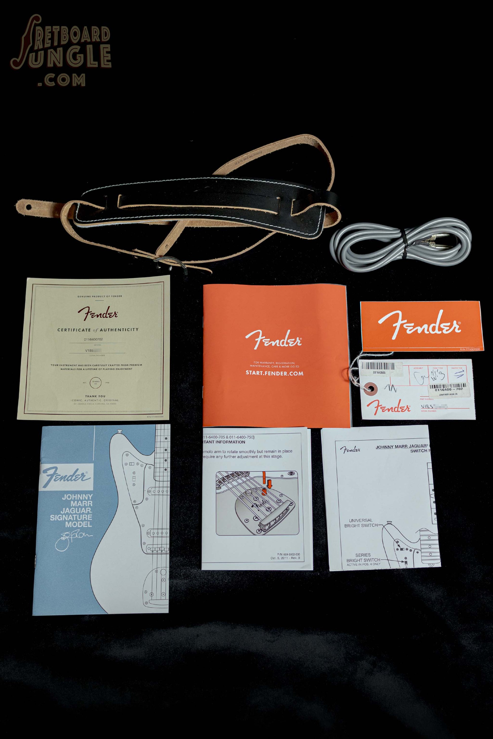 This guitar comes with its original hard shell case and a litany of case candy: a guitar strap, lead, and various pieces of documentation.