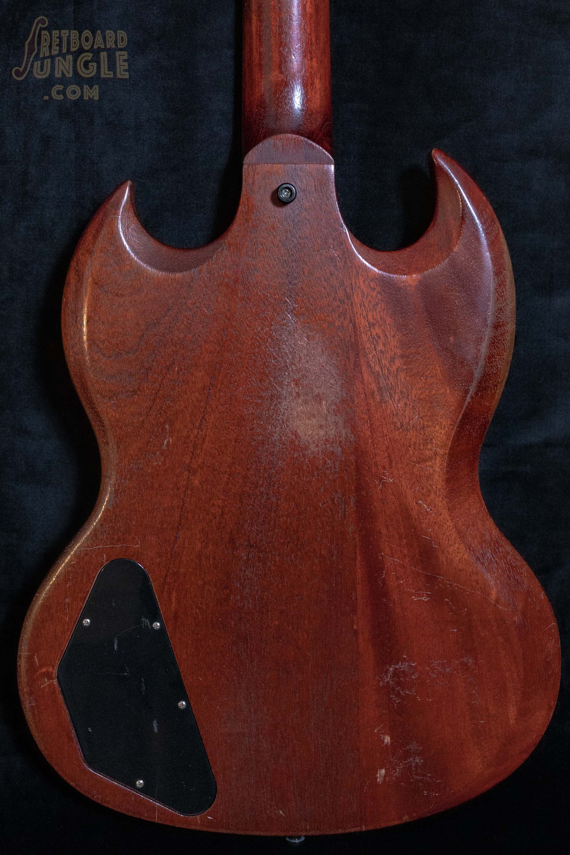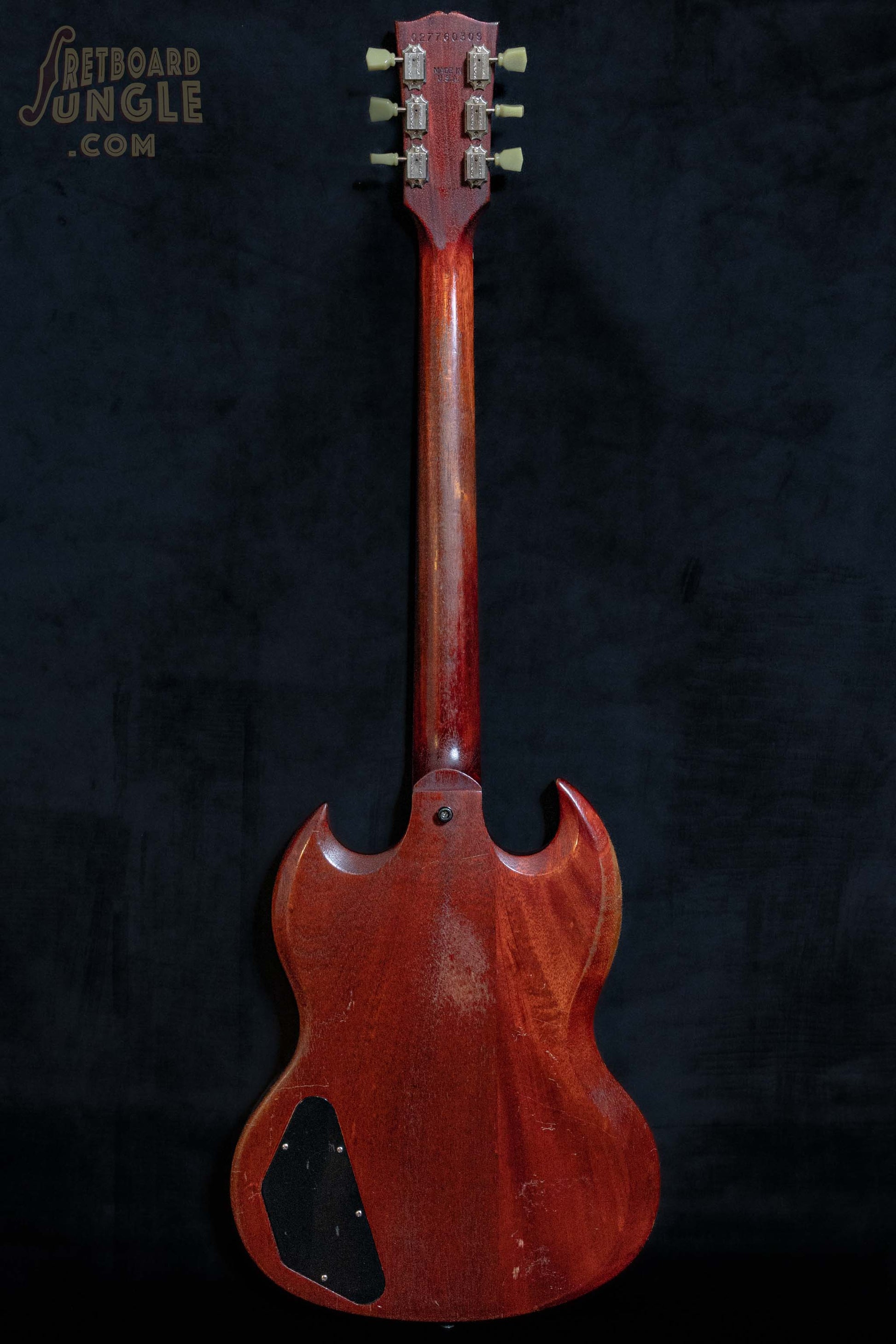This 2006 example features a worn cherry finish. In the pickup cavity we have “WC” for worn cherry and “SGSC” for SG Special. The thin nitro finish has naturally aged very nicely over the last 20 years. As well as the factory worn finish, this guitar has seen a lot of action and has a very nice authentic played in feel. At 3.22kg this guitar is nice and light. The neck is a medium C with a slight vintage heft. Not chunky, but a slight thickness to the shoulders. We think this neck feels great.